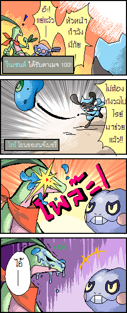 ฉากนี้อ้างอิงจากเหตุการณ์จริงที่ข้าน้อยเคยเล่นโปเกดันช่วงแรกๆงับ พอเราใกล้จะน๊อคเอาท์คู่หูเรา(ที่ให้ถือเบอรี่ไว้)จะโยนผลเบอรี่มาช่วยเรา